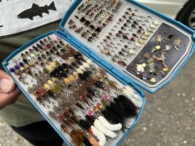 中峰さんのフライケース。タングステンビーズヘッドを使用したジグニンフがズラリと並びます。リードフライとドロッパーでサイズを変えて組み合わせるのが基本との事。比重の重いタングステンパターンがぎっしり詰まっているケースですので、相当な重量となります(笑)