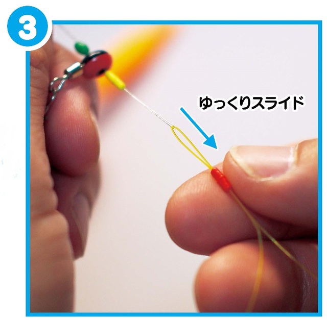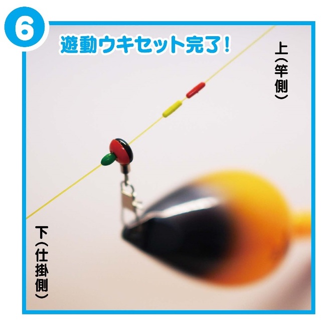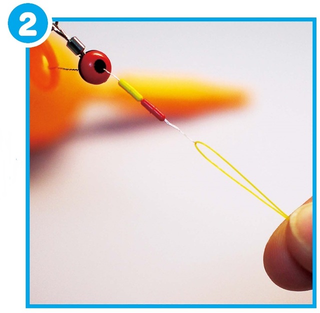 ⑤ 2個目のウキ止めゴム(黄)に続き、遊動スイベルも通します。