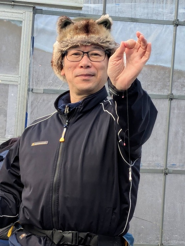 バスマンでこの日初めてワカサギ釣りにチャレンジの珈琲館のマスターは、すぐにアタリを取って釣るコツをつかんでご満悦。