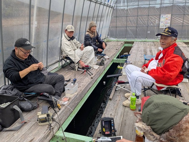 佐仲ダムでは雨風を凌げるドーム桟橋が3つあり、一番深いBドームがおすすめとの事で、この日初めてワカサギ釣りを体験される方が2名おられたので、Sさんから一番良い席を譲ってもらい釣り開始。