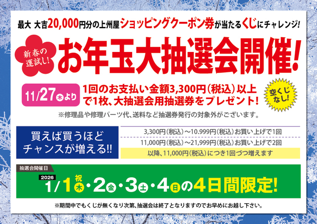 1月4日までにご指定金額をご購入のお客様に『お年玉大抽選会の抽選券』をお配りしております。大吉20000円分の上州屋ショッピングクーポン券が当たる空クジなしの抽選会に是非ご参加下さいませ。