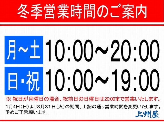 【本日より】冬季営業時間のお知らせ