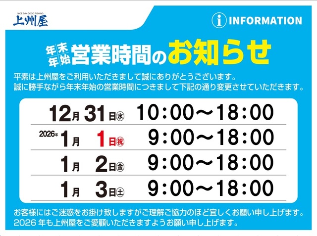 年末年始の営業時間のお知らせ