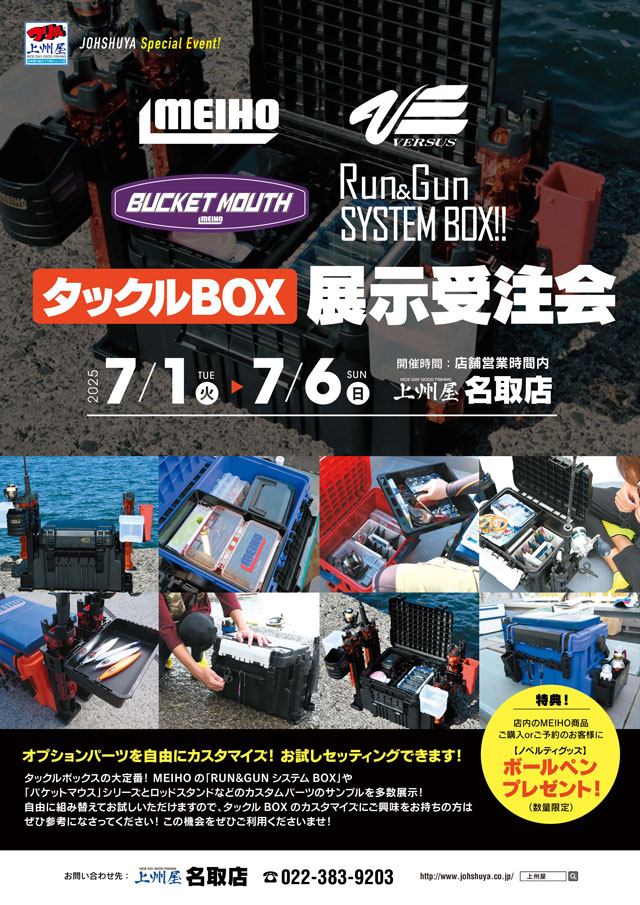 2025年7月1日(火)~6日(日)の6日間、上州屋名取店にてMEIHO、VERSUSタックルボックス展示受注会を開催します!
