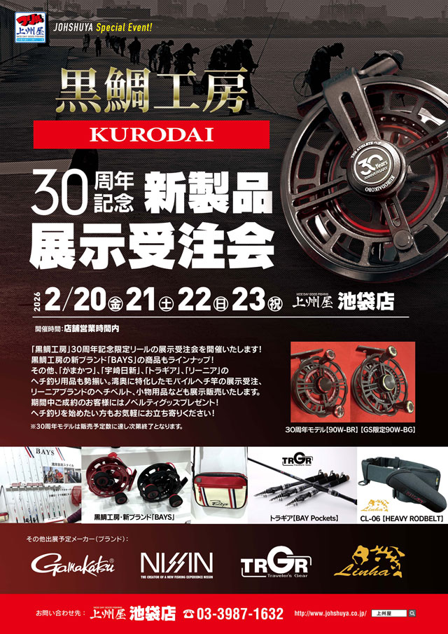 2026年2月20日(金)、21日(土)、22日(日)、23日(月祝)の4日間、上州屋池袋店にて黒鯛工房30周年記念限定リール展示受注会を開催!