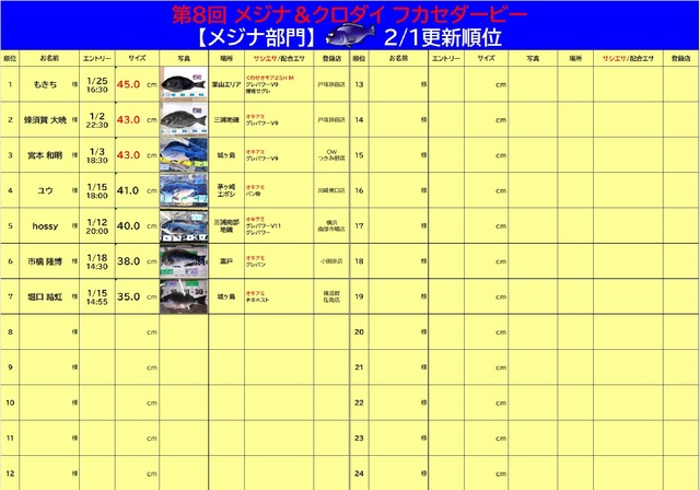 メジナ部門・クロダイ部門、2/1更新最終順位発表(1月分集計)。