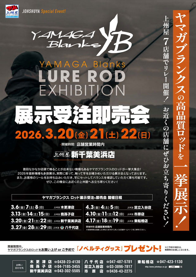 2026年3月20日(金)、21日(土)、22日(日)の3日間、上州屋新千葉美浜店にてヤマガブランクス社製、ルアーロッドの展示受注会を開催します!