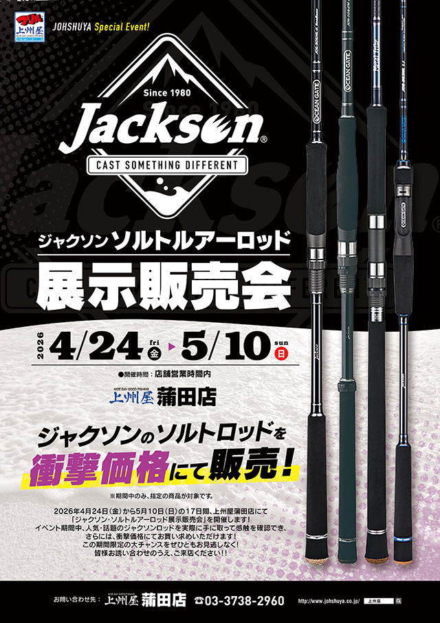 2026年4月24(金)~5月10日(日)の期間中、上州屋蒲田店にてジャクソン・ソルトルアーロッド展示販売会を開催します!
