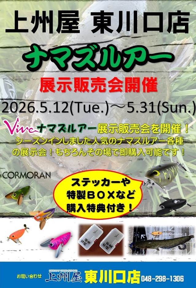 2026年5月12日(火)~5月31日(日)の期間中、上州屋東川口店にてコーモランVivaナマズルアーの展示即売会を開催します!