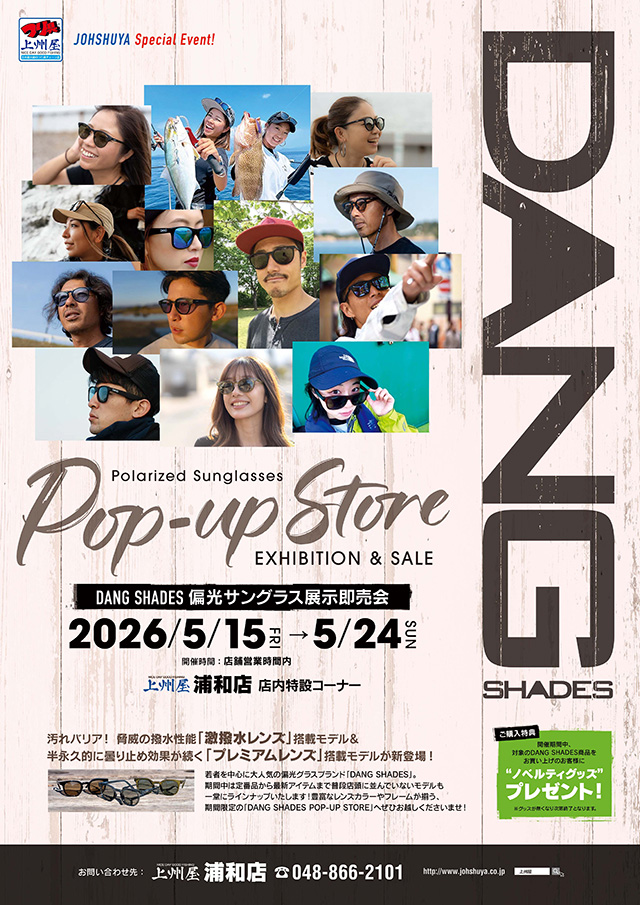 2026年5月15日(金)~24日(日)の10日間、上州屋浦和店にてDANG SHADES(ダン・シェイディーズ)偏光グラスの展示即売会を開催します!