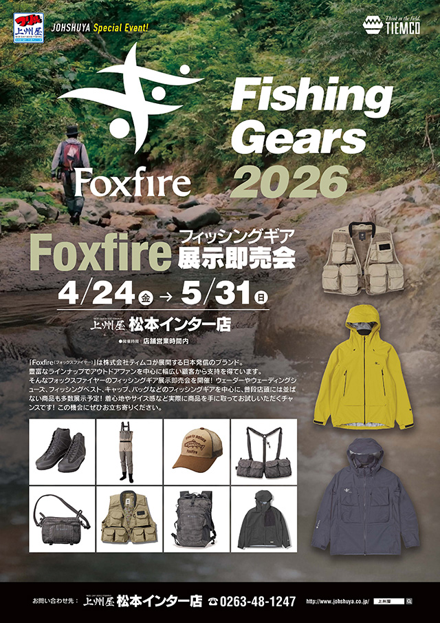 2026年4月24日(金)~5月31日(の期間中、上州屋松本インター店にてTIEMCOが発信する日本発のブランド、FoxFire(フォックスファイヤー)の展示即売を開催します!