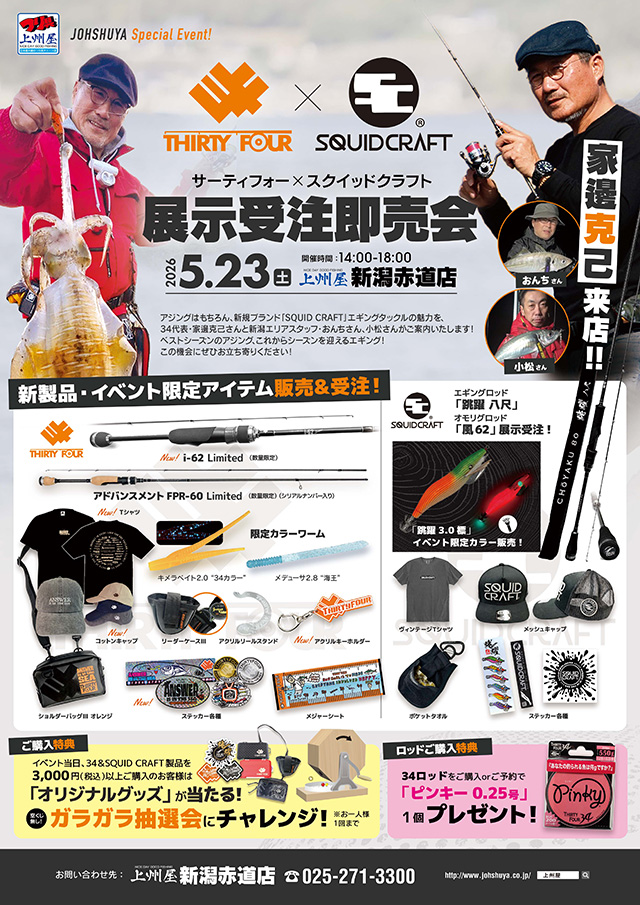 2026年5月23日(14:00~18:00、上州屋新潟赤道店にて「THIRTY34FOUR」&新規プロダクト「SQUID CRAFT」の展示受注販売会を開催!34代表、家邊克己さんと、地元新潟のフィールドに精通する現地エリアスタッフ小松康夫さんおんちさん来店します!