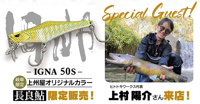 当日はスレ切った魚にスイッチを入れる横スライドルアーIGNA(イグナ)50Sの上州屋オリジナルカラー「長良鮎」を数量限定販売!