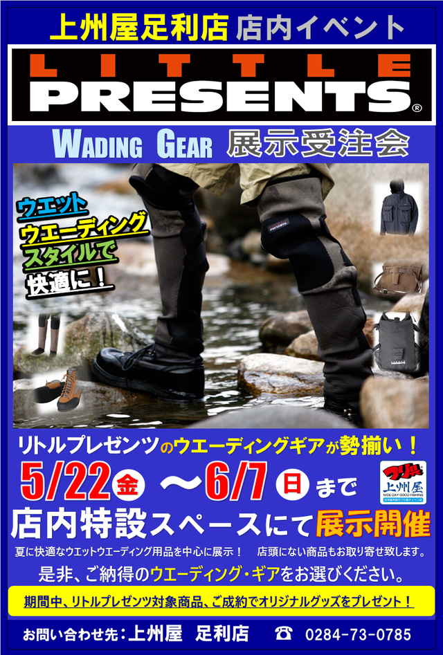 リトルプレゼンツの渓流用「ベスト」「ウェーダー」「ウェーディングシューズ」「ゲーター」etc.普段の店頭には並ばないモデルも多数展示!気になる商品をその場でご注文承ります。