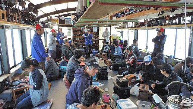 こちらが例年お世話になっているドーム船(山中湖、湖明荘ドーム船)内部の様子。板の間に座布団、ストーブの効いた暖かい船内で、この先冷え込みが厳しくなっても船内では快適に釣りを楽しむことが出来ます。近年、こうしたドーム船でのワカサギ釣りが各地で大人気です!