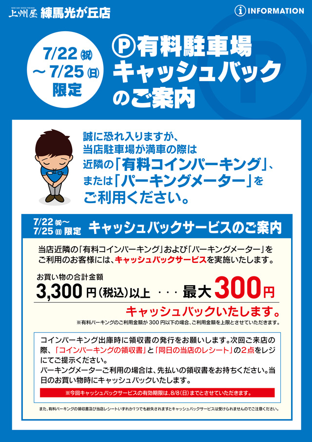 ※キャッシュバックサービスのご利用には有料パーキングの領収書と、同日の上州屋練馬光が丘店のレシート(ご利用金額税込3,300円以上)の2点が必要です。1つでも紛失されますとサービスをご利用いただけません。※先払い式のパーキングメーターご利用の際はパーキングの領収書をお持ちいただければ、当日税込3,300円以上のお買い物時にキャッシュバックいたします。※キャッシュバックサービスは7/22(木)~7/25(日)までのご利用分に関して、8月8日(日)まで受付いたします。期日が過ぎた際はご利用いただけませんのでご注意ください。
