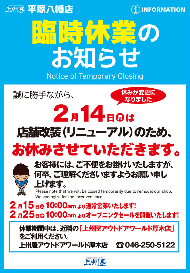 上州屋平塚八幡店、店舗改装による2/14(月)臨時休業および2/25(金)リニューアルオープンSALEスタートのお知らせ。