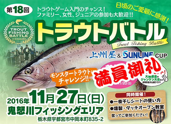 2016年11月27日()、第18回トラウトバトル2016「上州屋&SUNLINE cup」が栃木県鬼怒川フィッシングエリアにて開催されました。