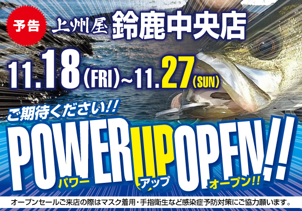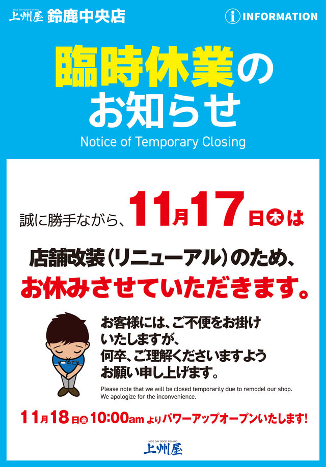 上州屋鈴鹿中央店、店舗改装による11/17(木)臨時休業および11/18(金)パワーアップオープンのお知らせ。