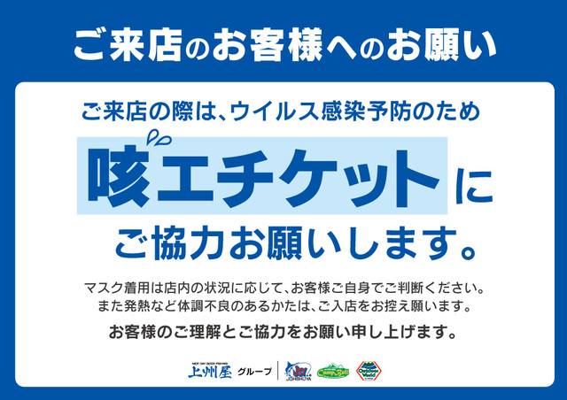 また、咳やくしゃみが出そうな際にマスクやティッシュ、ハンカチ、袖などで口や鼻をおさえる、咳エチケットにご協力お願いします