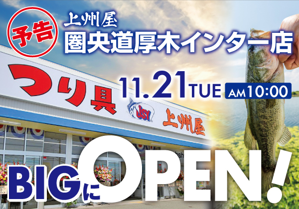 11月21日(火)オープン、上州屋圏央道厚木インター店はソルトルアー各種、エギング、バス、トラウト強化店!磯・投げ・堤防用品や船用品も充実!活きエサ、冷凍エサ、配合エサ各種取り揃えて皆様の釣行を応援します!