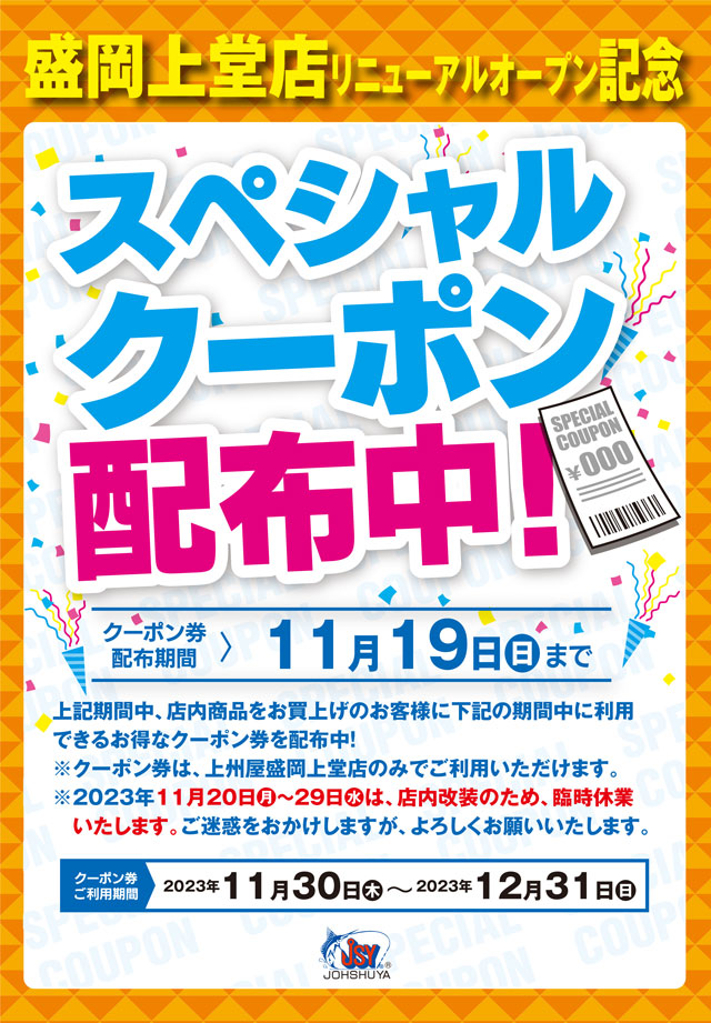 只今、上州屋盛岡上堂店にて店内商品お買い上げのお客様に同店リニューアルオープン後(2023年11月30日~12月31日)にご利用いただけるスペシャルクーポン配布中!