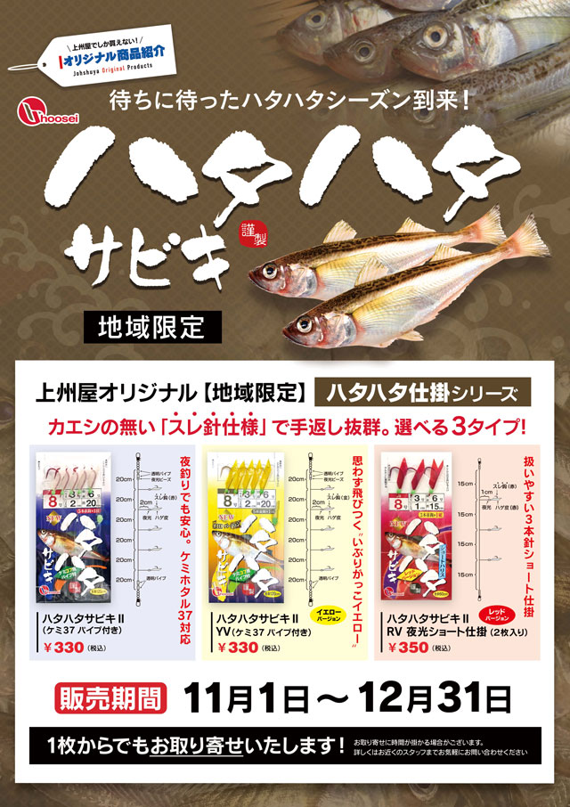 東北日本海、冬の風物詩!ハタハタ釣りのシーズンがやって来る!今年も上州屋が東北日本海のハタハタ釣りを熱烈応援!例年ご好評を頂いておりますオリジナル仕掛けを今年も地域&期間限定(※)にて販売します!