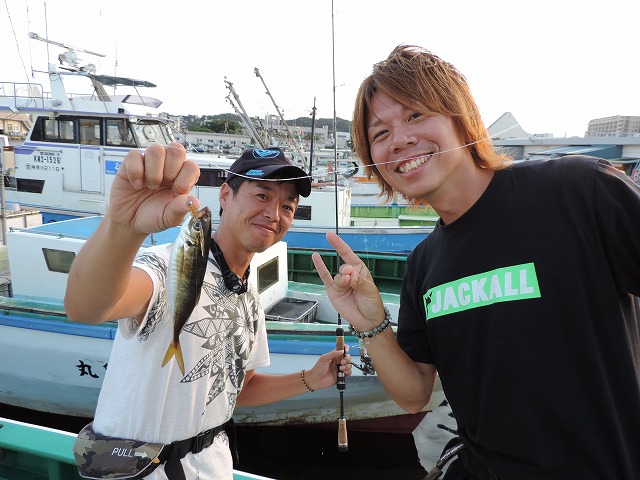 何といきなり釣れてしまいました!出船前のレクチャータイム、船上でJACKALL吉岡プロの指導に従ってリグの動かし方を確認していたらコン!と竿先がもって行かれてご覧のとおり。何とその後もレクチャー中のロッドが次々と曲がってアジが釣れてしまうという嬉しいハプニングが発生!