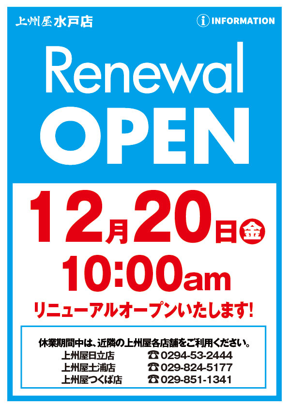 上州屋水戸店、店舗改装による12/19(木)臨時休業および12/20(金)リニューアルオープンのお知らせ。