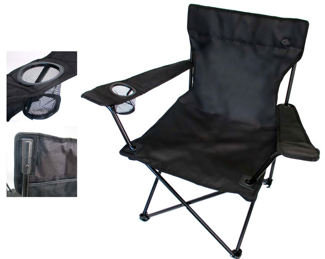 組み立て簡単、「収納用の袋」もついて持ち運びも楽々!便利な「肘掛け」と「カップホルダー」付き、背もたれ背面にメッシュポケット搭載!