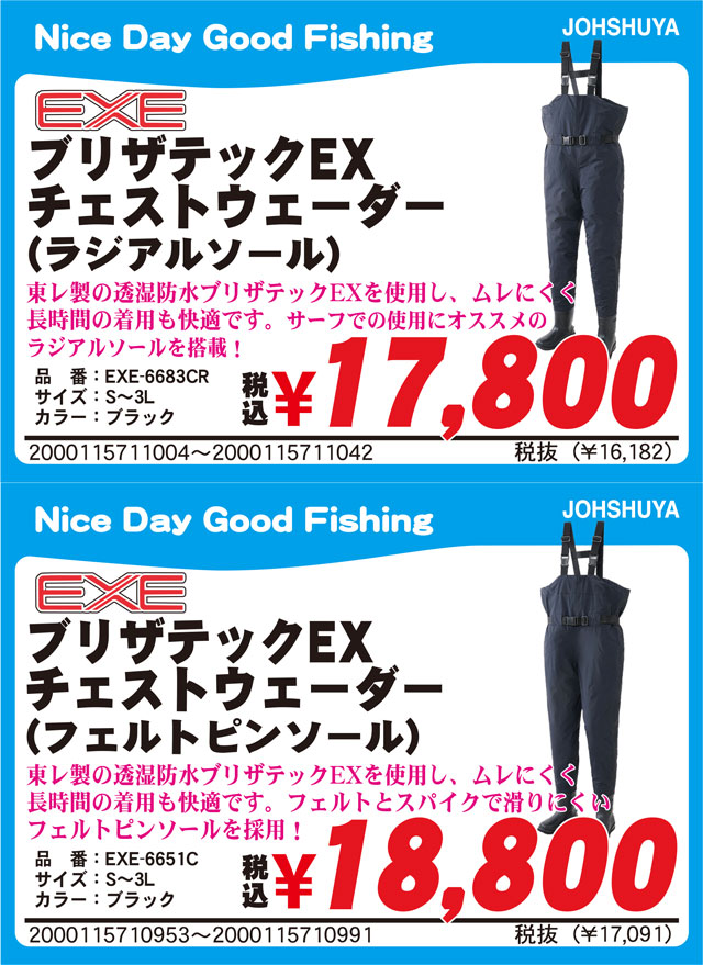 RYOBI“EXE(エグゼ)”シリーズより、「ブリザテックEXチェストウェーダーEXE-6683CR(ラジアルソール)」および「ブリザテックEXチェストウェーダーEXE-6651C(フェルトピンソール)」が登場!