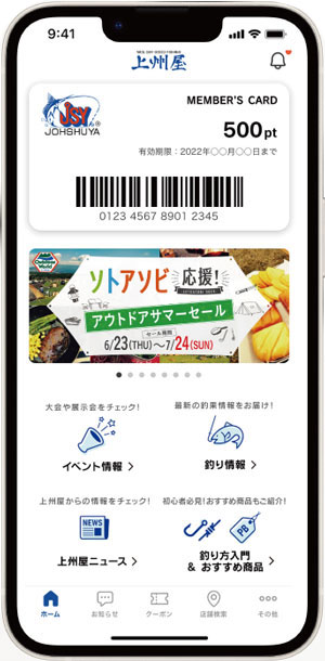 釣果情報、商品情報、釣り入門、クーポン、イベント情報etc.が盛り沢山!上州屋アプリはダウンロード&登録無料!
