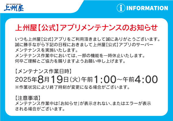8/19(火)深夜~早朝、上州屋【公式】アプリメンテナンスに伴う一部機能停止のお知らせ