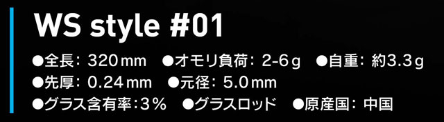●全長:320mm ●オモリ負荷:2-6g ●自重:約3.3g ●先厚:0.24mm ●元径:5.0mm ●グラス含有率:3% ●グラスロッド ●原産国:中国