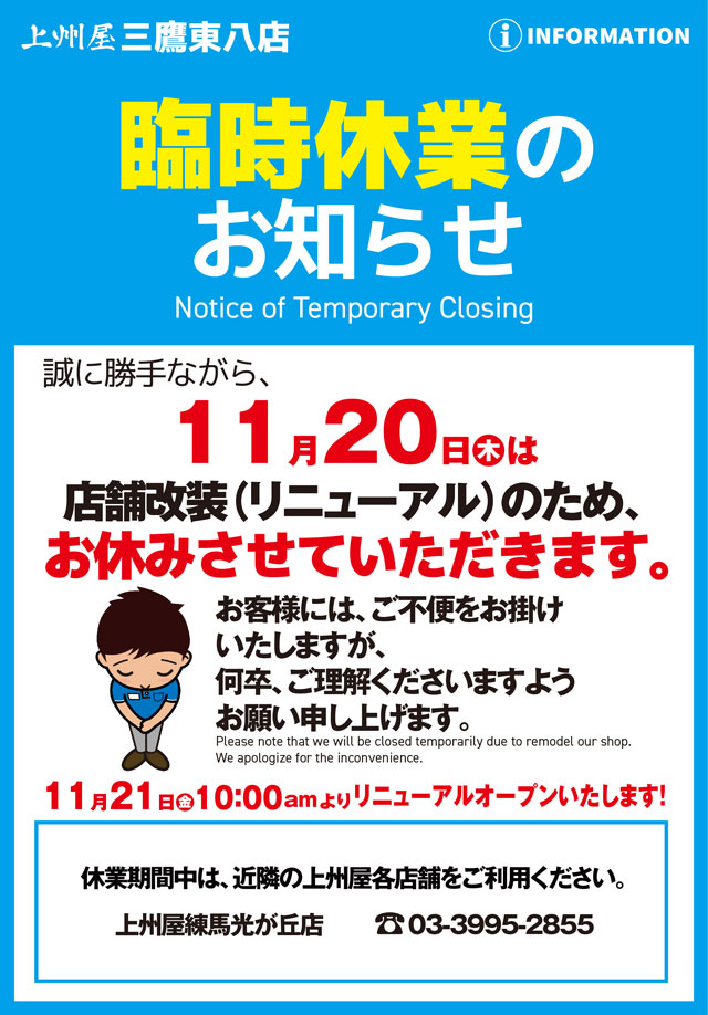 上州屋三鷹東八店、店舗改装による11/20(木)臨時休業および11/21(金)リニューアルオープンのお知らせ。