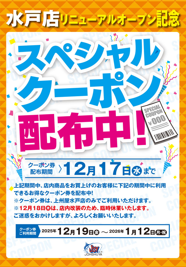 只今、上州屋水戸店では店内商品お買い上げのお客様に同店リニューアルオープン後(12月19日~翌1月12日)にご利用いただけるスペシャルクーポン配布中!