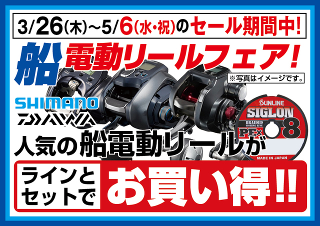 3月26日(木)~5月6日(水・)のセール期間中、シマノ、ダイワの人気電動リールがラインとセットでお買い得