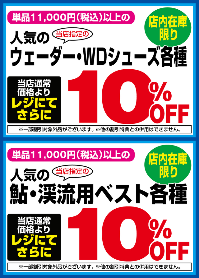 当店指定の人気の単品11,000円(税込)以上のウェーダー・WDシューズ各種、鮎・渓流用ベスト各種が、店内在庫限り当店通常価格よりレジにてさらに10%OFF