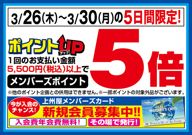 3月26日(木)、27日(金)、28日()、29日()、30日(月)の5日間限定、1回のお支払い金額5,500円(税込)以上でメンバーズポイント5倍