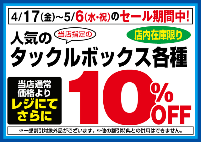 4月17日(金)からのセール期間中、当店指定在庫限り、人気のタックルボックス各種が当店通常価格よりレジにてさらに10%OFF