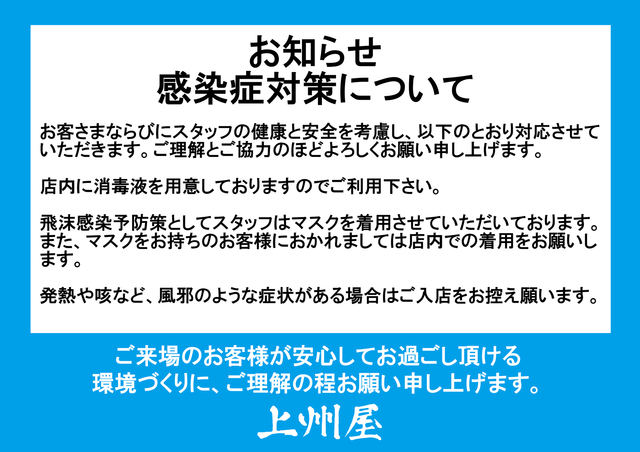 「店内に消毒液を用意しておりますのでご利用下さい」「飛沫感染予防策としてスタッフはマスクを着用させていただいております。また、マスクをお持ちのお客様におかれましては店内での着用をお願いします」「発熱や咳など、風邪のような症状がある場合はご入店をお控え願います」