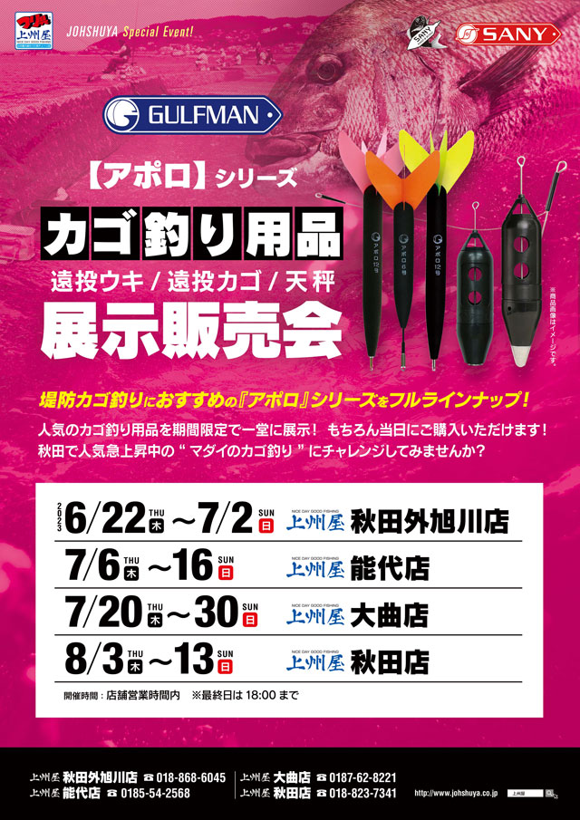 人気釣り場「秋田北防波堤」で、年々人気が高まる「マダイのカゴ釣り」!今回はカゴ釣りでおなじみ、サニー商事「アポロシリーズ」を一堂に展示し、秋田の各店をリレー形式で商品が巡ります!