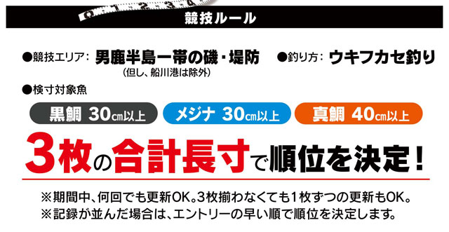 男鹿半島一帯の磯、堤防にてウキフカセ釣りで釣り上げた「黒鯛(30cm以上)」「メジナ(30cm以上)」「真鯛(40cm以上)」3枚の合計長寸を競います!釣れば釣るほどもらえる抽選券による参加特典も!