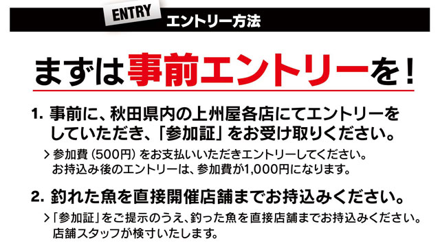 事前エントリーは上州屋秋田外旭川店、秋田店、大曲店3店いずれかの店頭にて、開催1か月前(10/1~)よりお申込み承ります。店頭に備え付けの参加申込書に必要事項を記入の上、参加費500円を添えて事前にお申込み下さい。引き換えにエントリーに必要となる参加証をお渡しします。