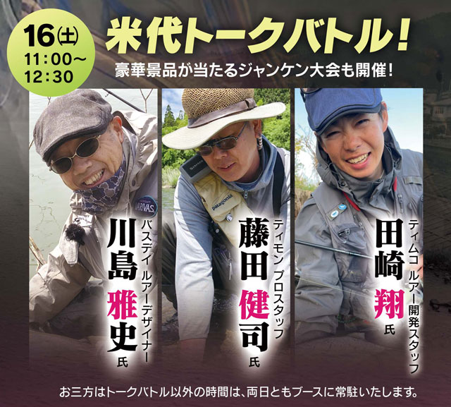 イベント初日3月16日()11:00~12:30の時間帯には「米代トークバトル」と題して、3人のプロアングラーの視点から今季の米代川サクラマスの予測や釣り方、ポイント選択、有効なルアーなどなど、百戦錬磨のノウハウをスタッフ大原が深掘りしていきます!