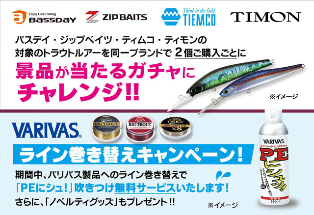 バスデイ・ジップベイツ・ティムコ・ティモンの対象トラウトルアーを同一ブランドで2個お買い上げ毎に景品が当たるガチャチャレンジ