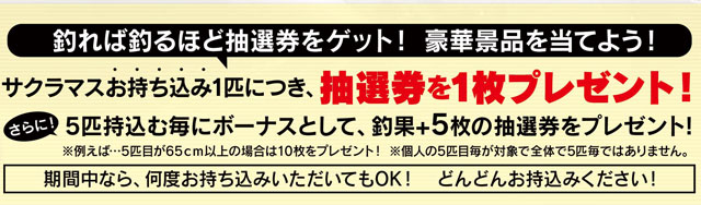釣れば釣るほど抽選券をゲット!検量対象サイズのサクラマスエントリー1匹につき、抽選券を1枚プレゼント!さらに、5匹持ち込む毎、または65cm以上のビッグサイズにはボーナス抽選券もございます!