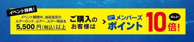 イベント期間中、当店指定のルアーロッド、ルアー、ルアー用品を5,500円(税込)以上、ご購入のお客様はメンバーズポイント10倍!