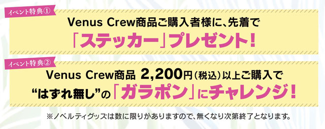 今回イベントにてVenusCrew商品ご購入者様に先着でステッカープレゼント!VenusCrew商品2,200円(税込)以上ご購入で“はずれなし”のガラポンにチャレンジ!