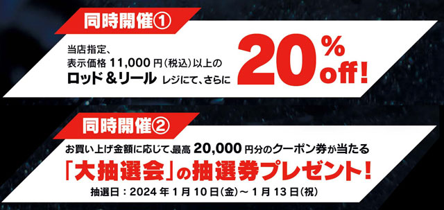 オススメのロッドやリールを一挙に展示!さらに期間中は当店指定、税込11,000円以上のロッドやリールがレジにて最大20%OFF!